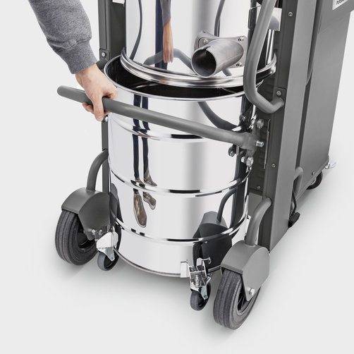 简单省时的容器拆卸 尘箱手柄可作为辅助,用于将机器拉至排空点 大型工业用滚轮可确保良好的移动性,即使在不均匀的地面和重载状态
